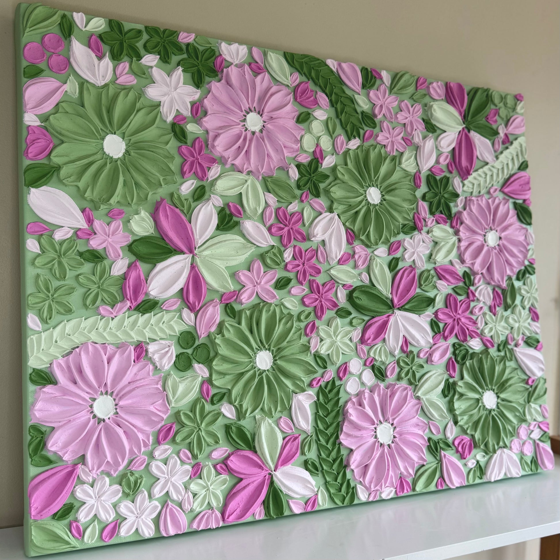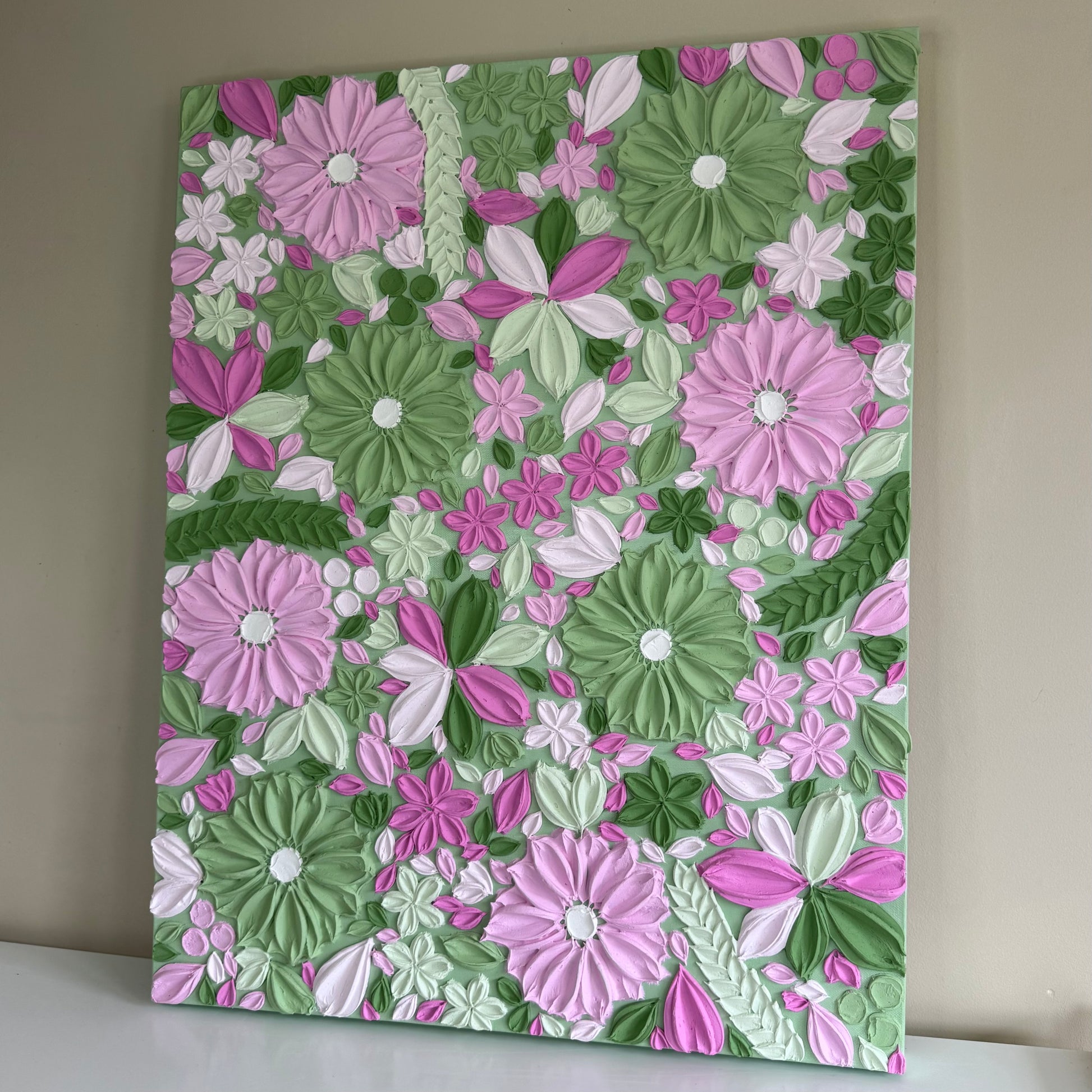 Sweet, playful, and full of charm, Candy Blossom is a joyful piece bursting with floral texture. With a dreamy mix of soft pinks and greens, this artwork creates a sense of whimsy and delight.