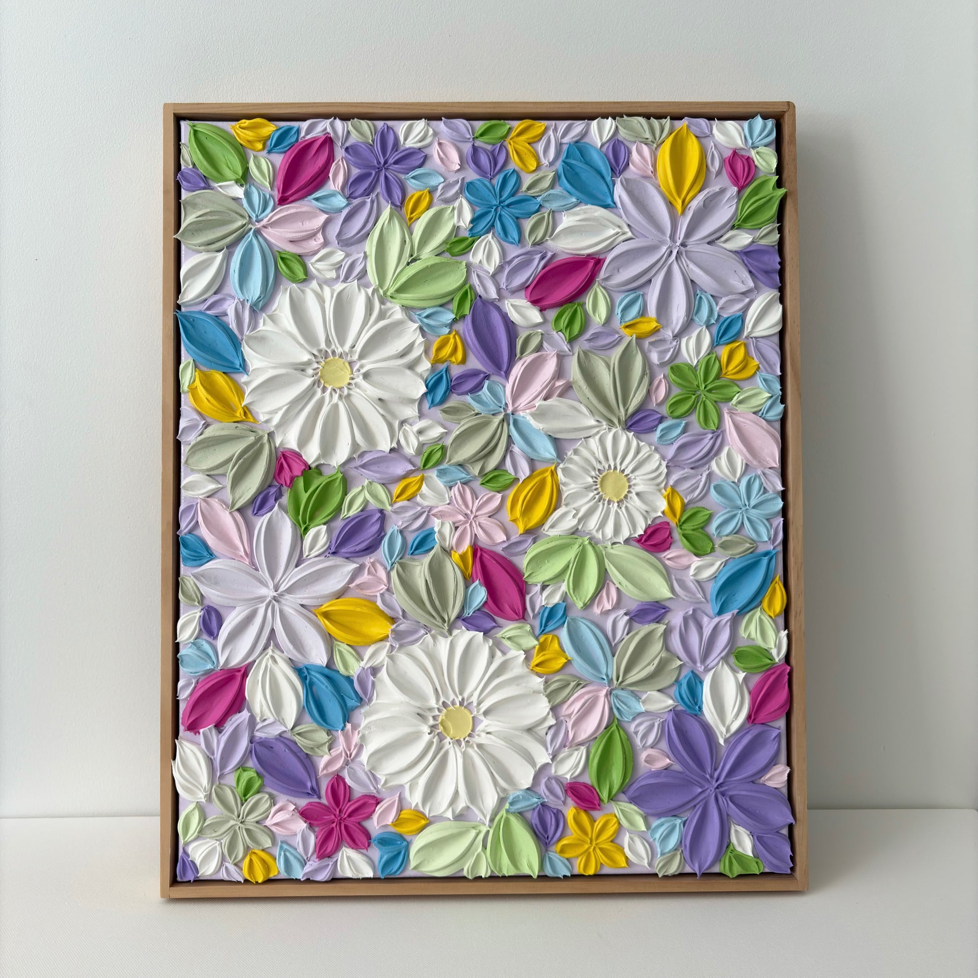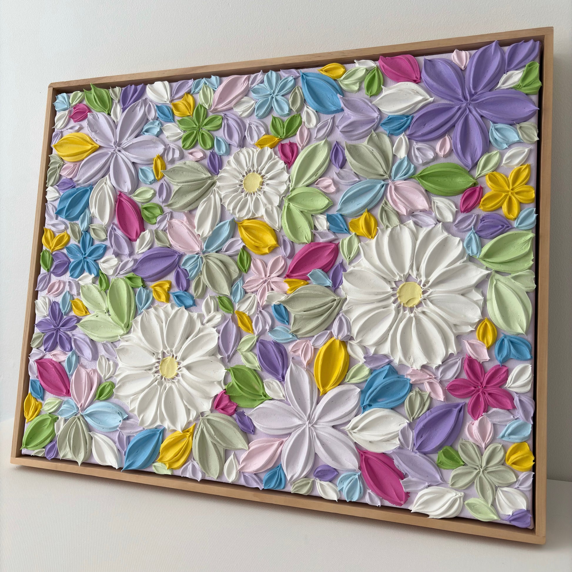 Textured floral painting featuring daisies surrounded by florals in a fun mix of colours. Set against a lilac purple background, and complete with a frame.