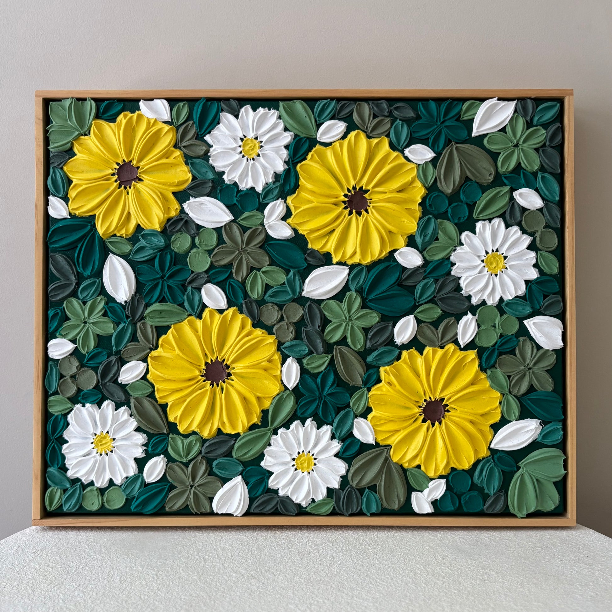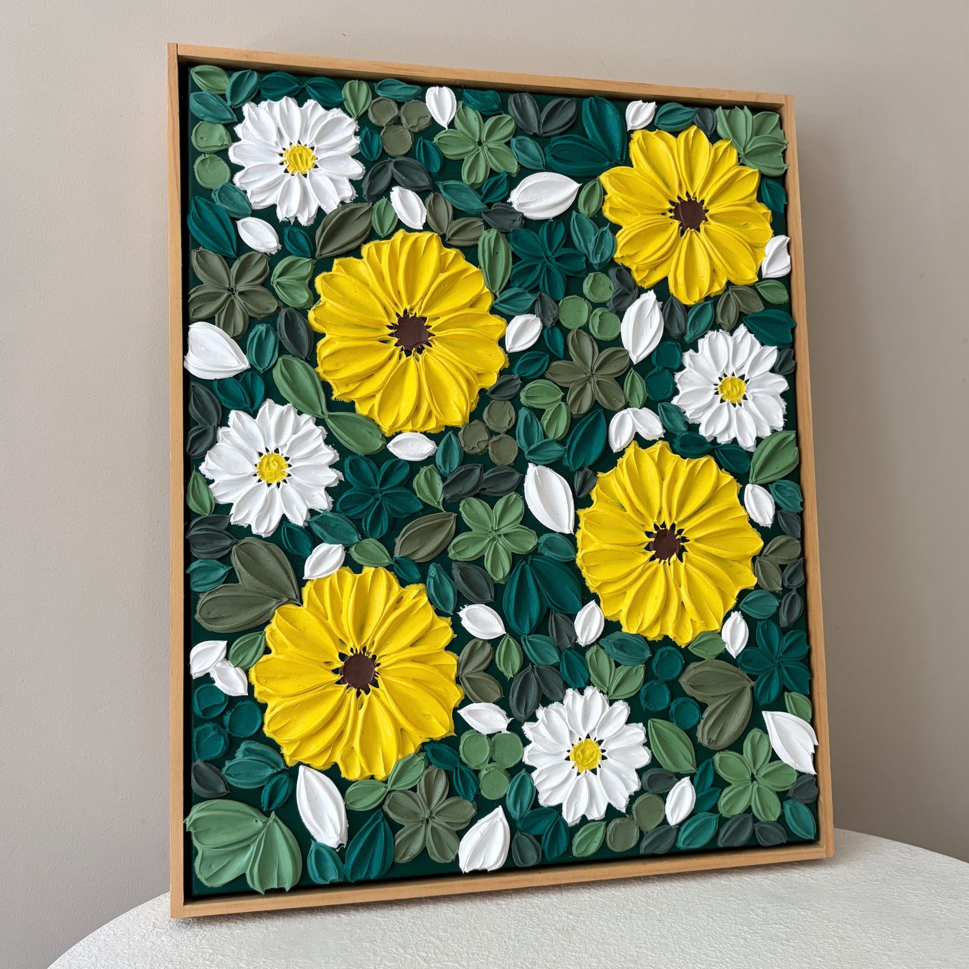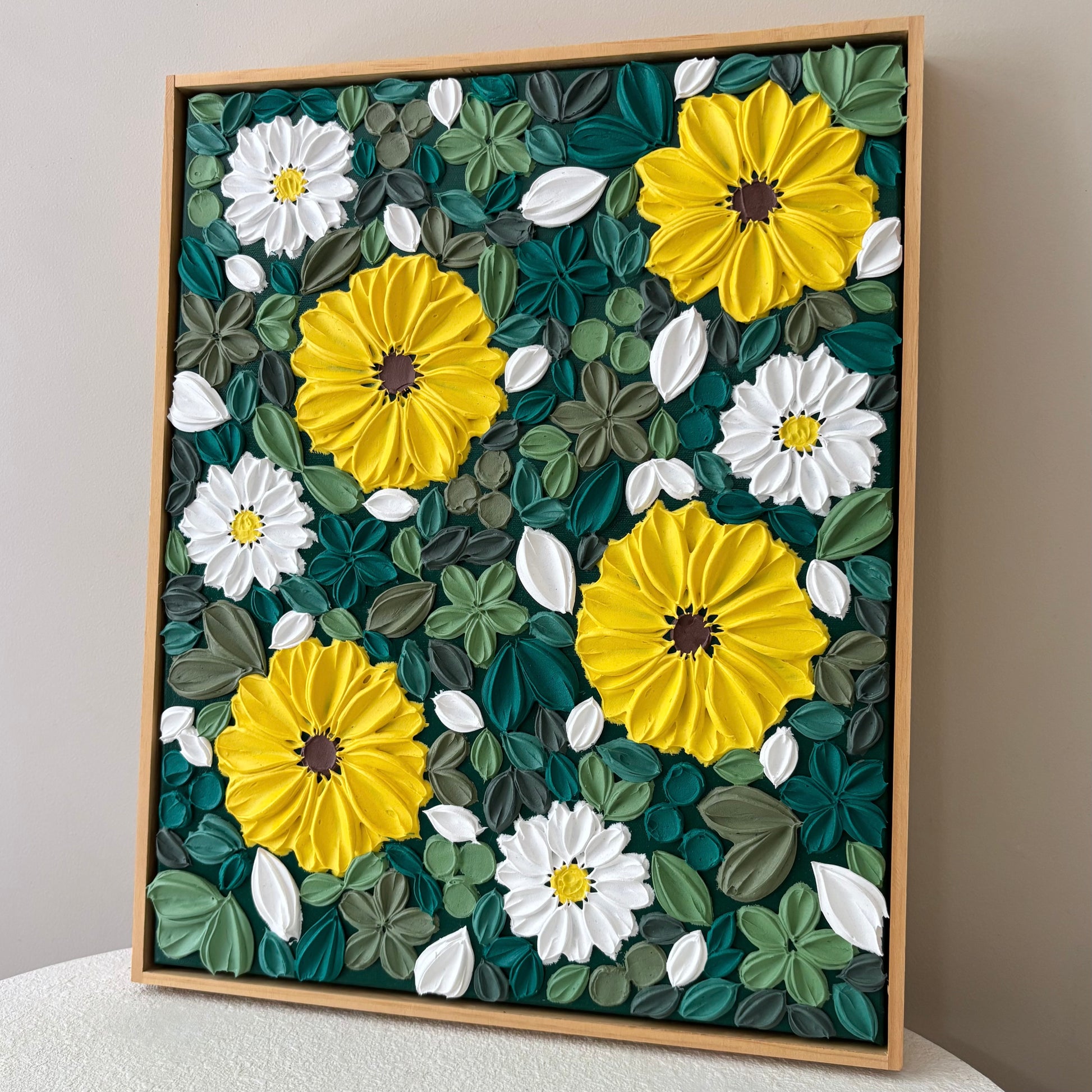 Textured floral painting in mixed shades of green, alongside yellow and white, and set against a matching deep forest green background.