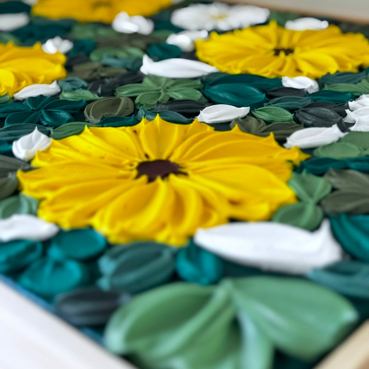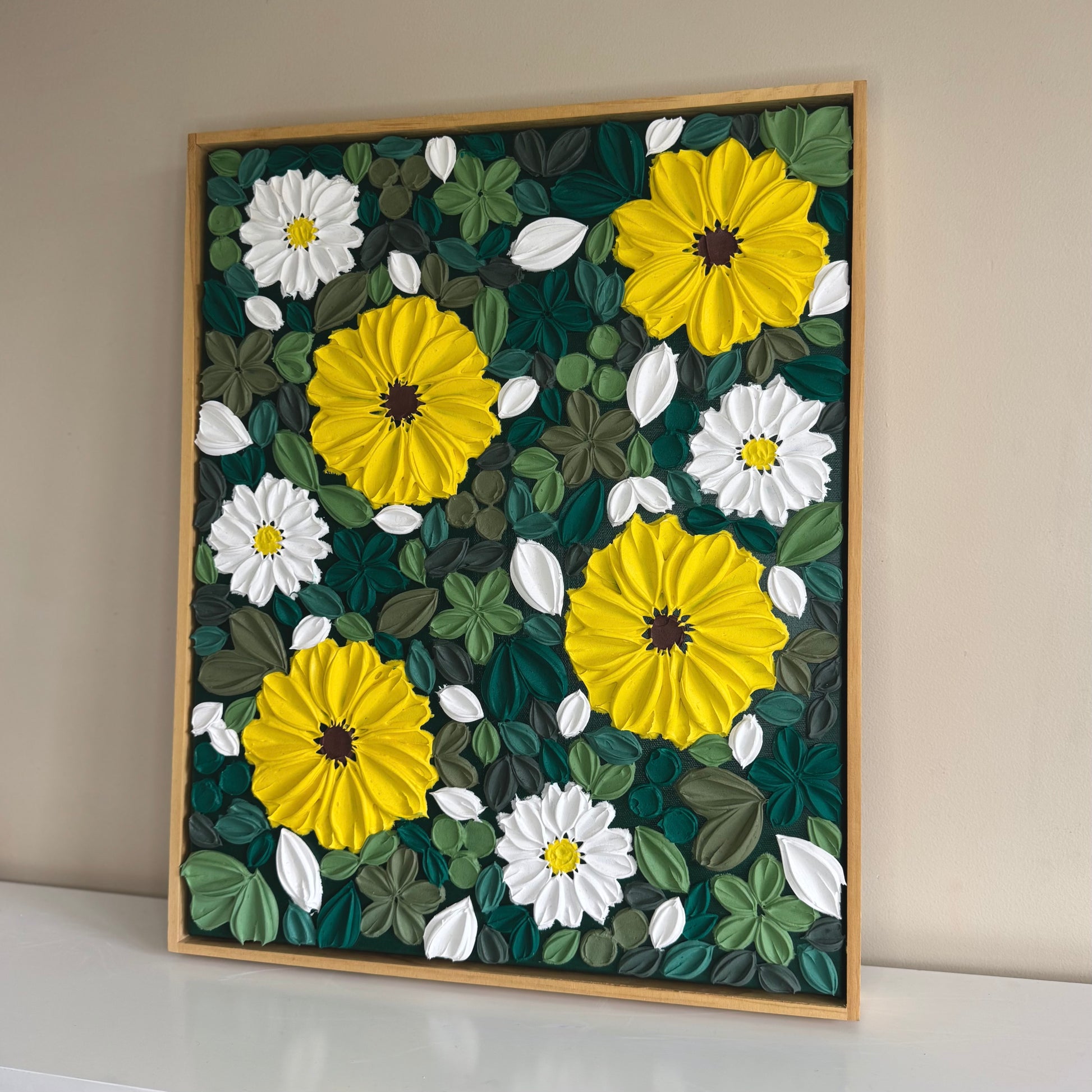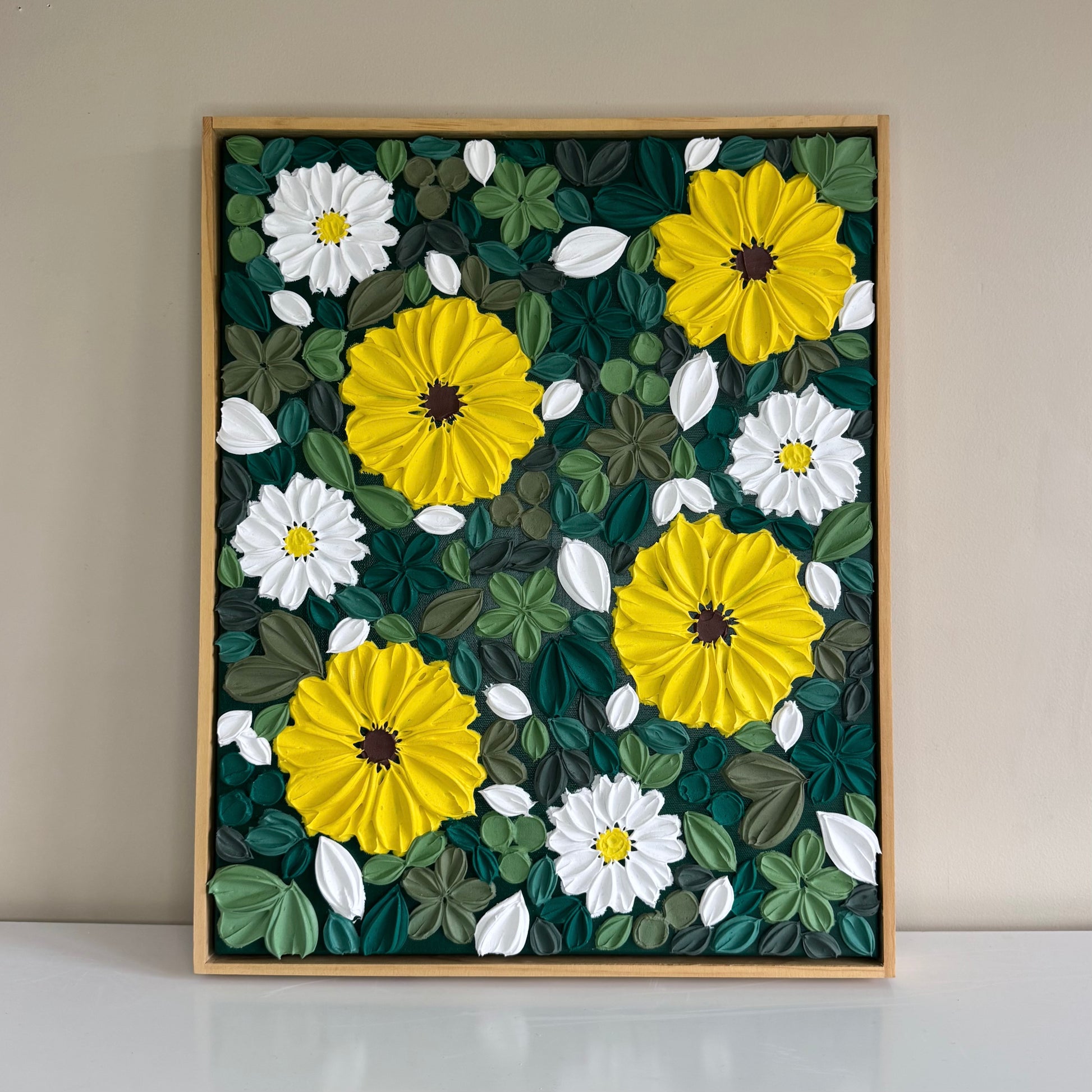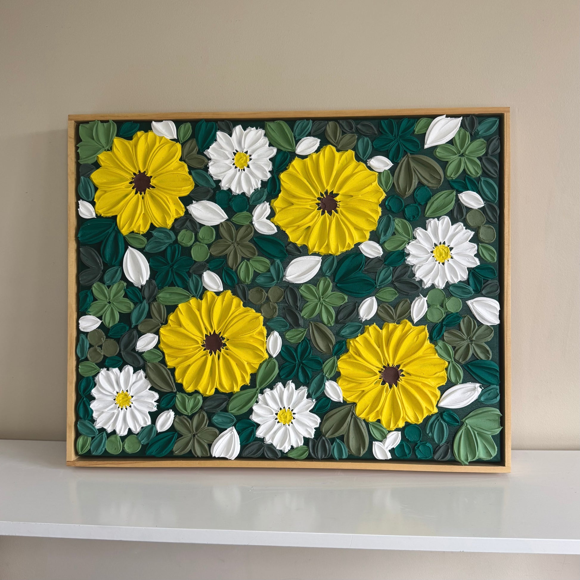 Add a little light to your space with Flourish. This textured floral painting bursts with vibrant yellow sunflowers, daisies, and lush green petals, all set against a deep green background.