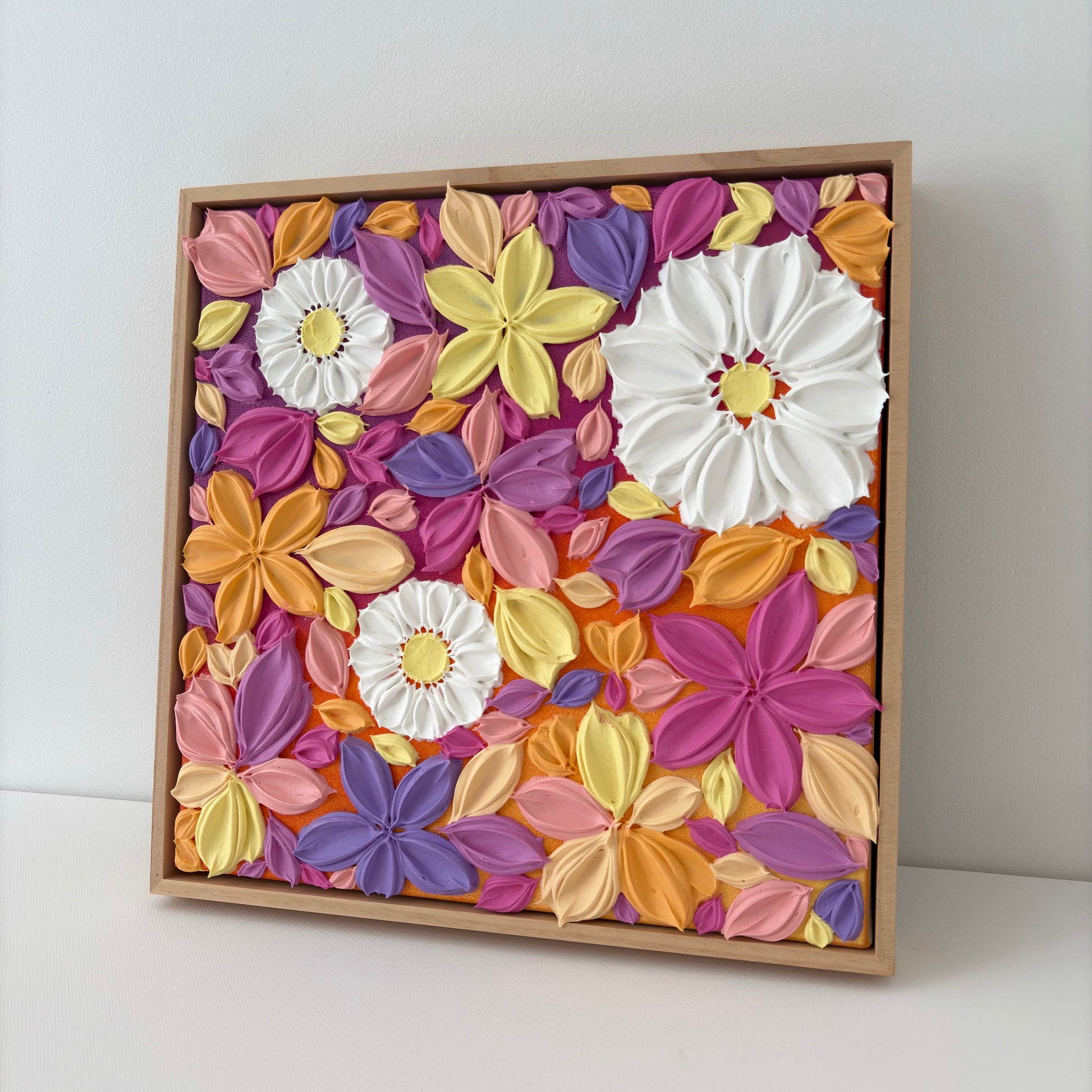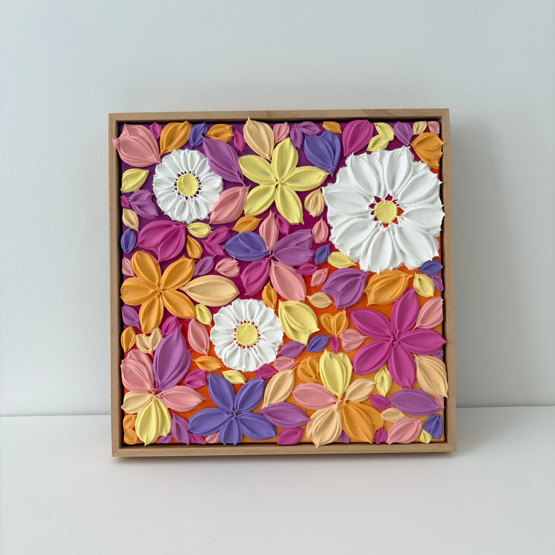 Textured floral painting featuring daisies alongside florals in mixed shades of pink, purple, yellow and orange. Set against a matching background, and complete with a frame.