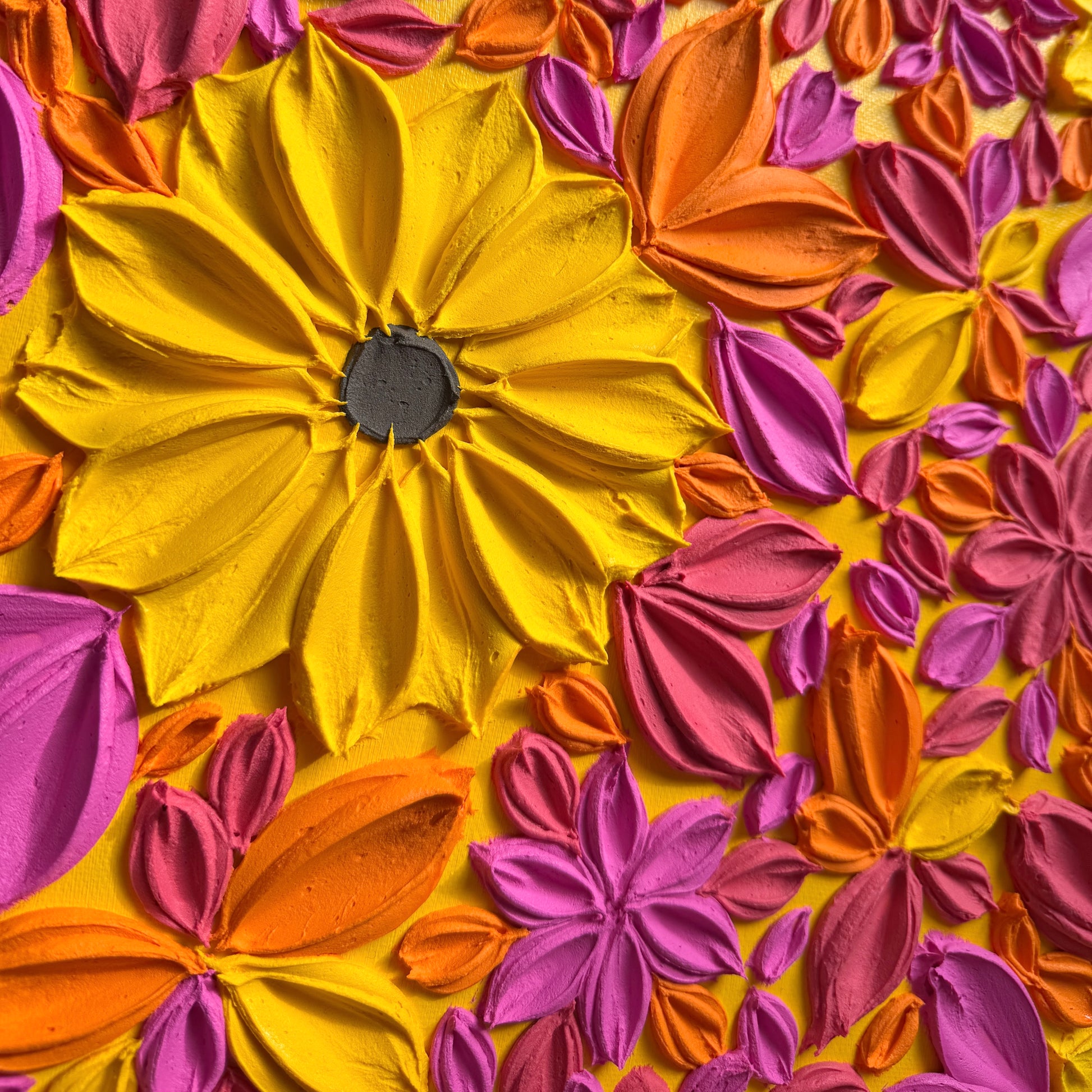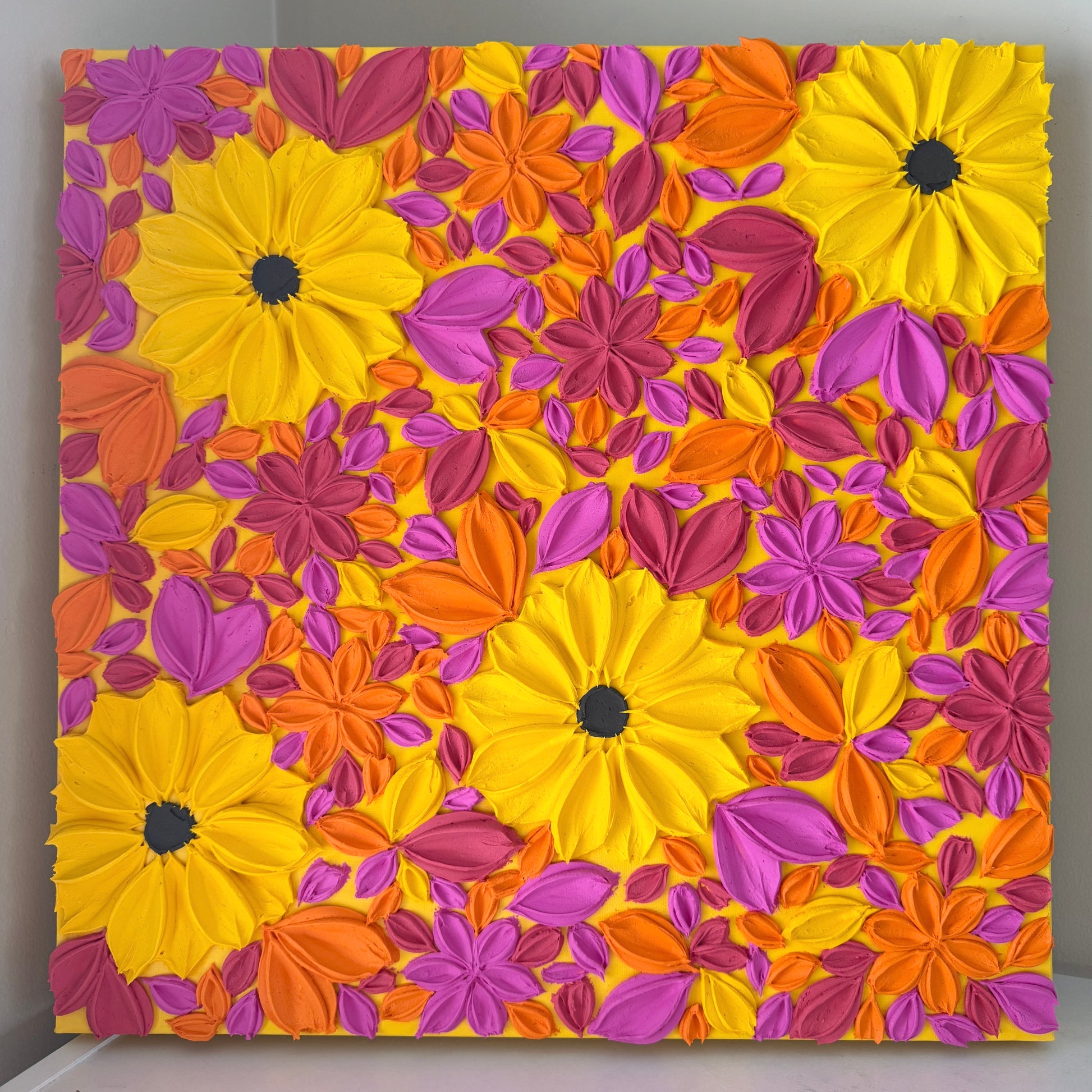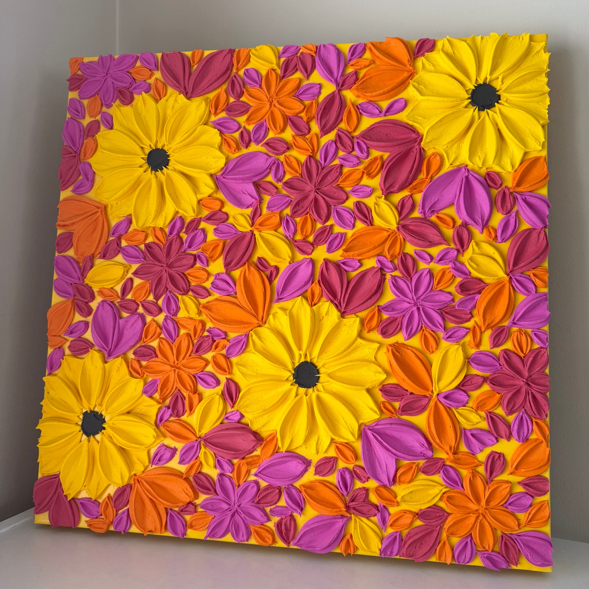 Bursting with colour, Hello Sunshine radiates happiness, positivity, and good vibes. With cheerful sunflowers and pops of orange, red, and magenta florals dancing in between, this piece feels like sunshine for your wall.