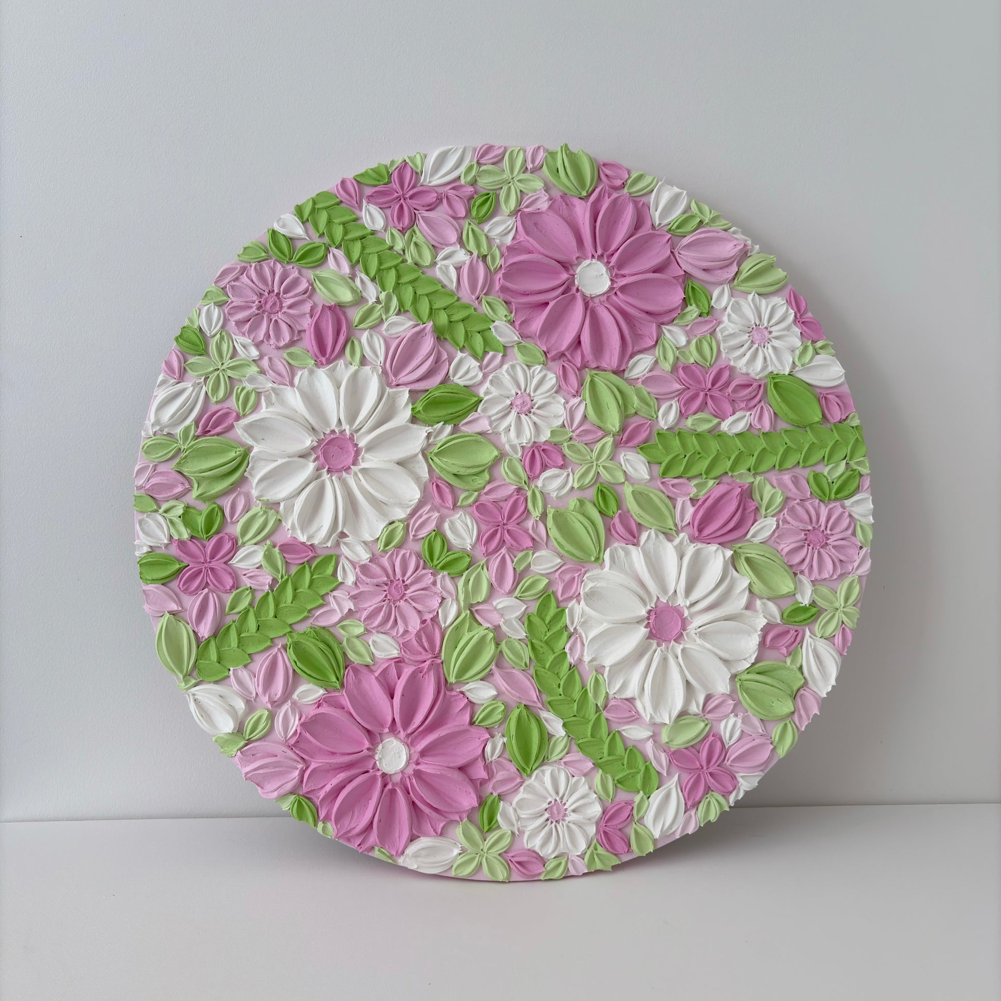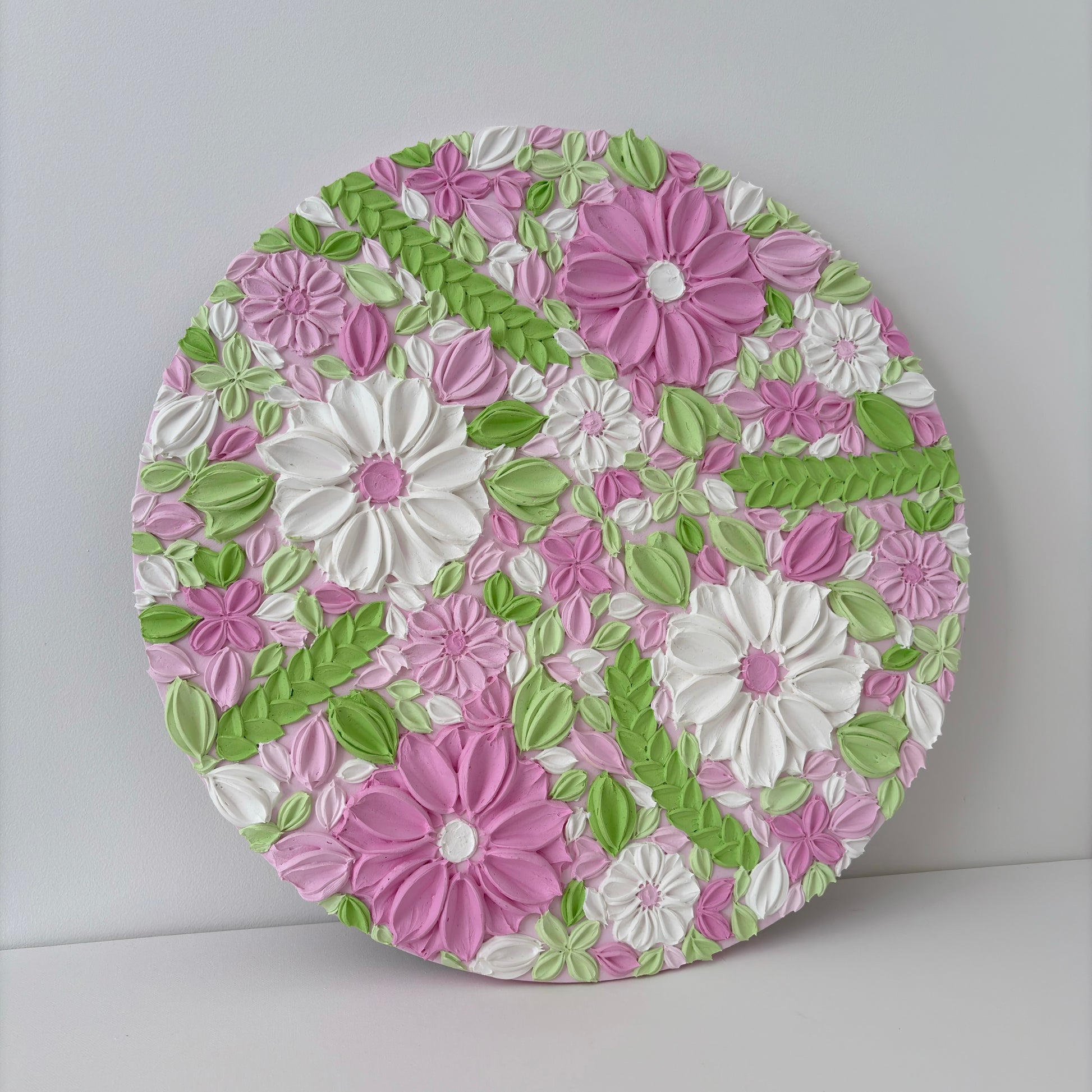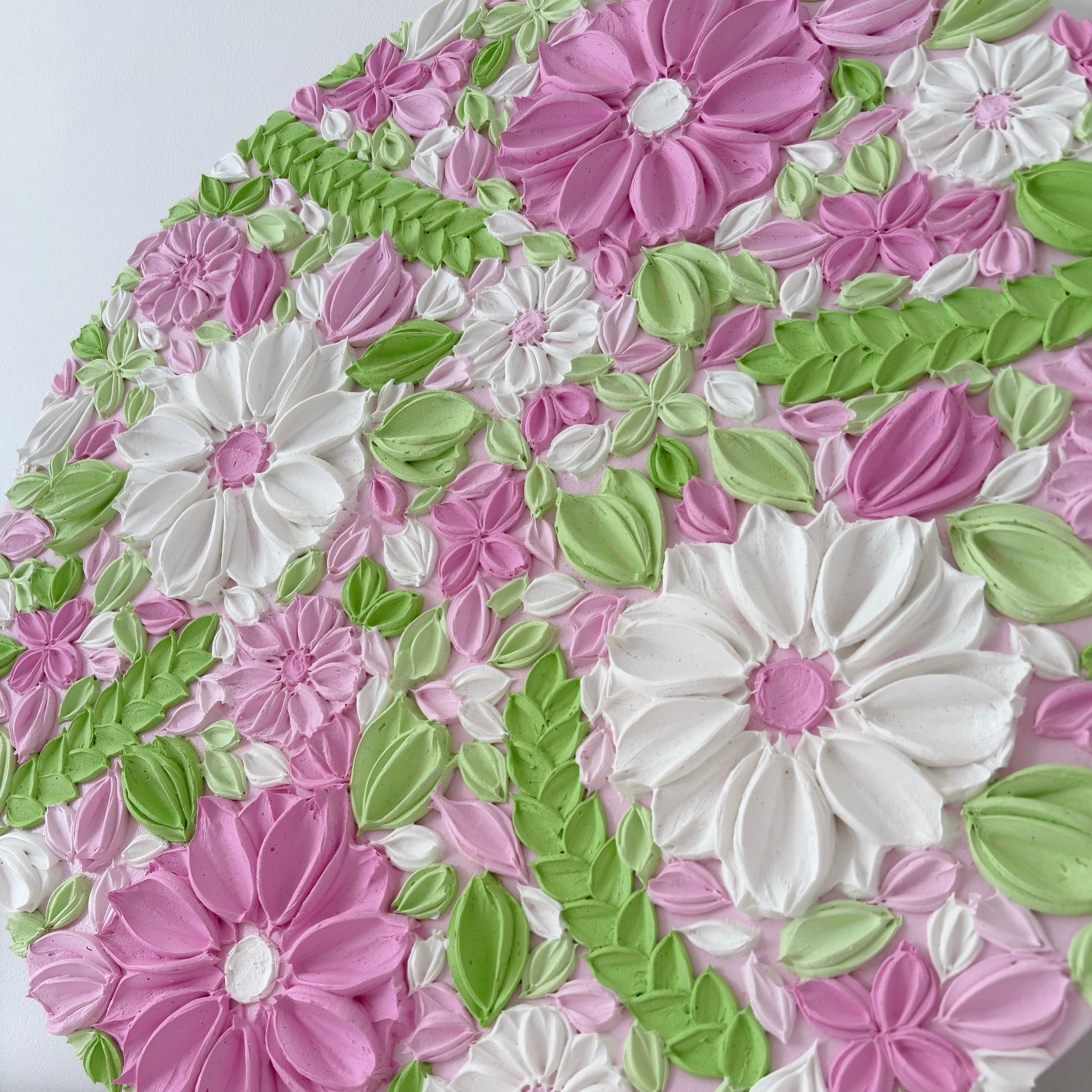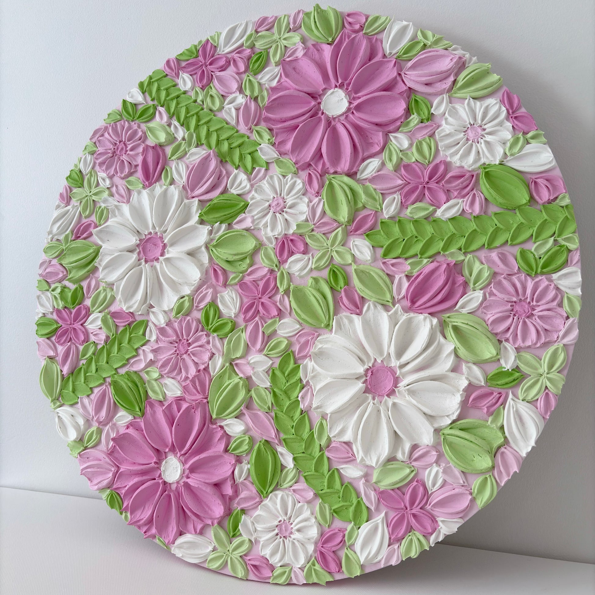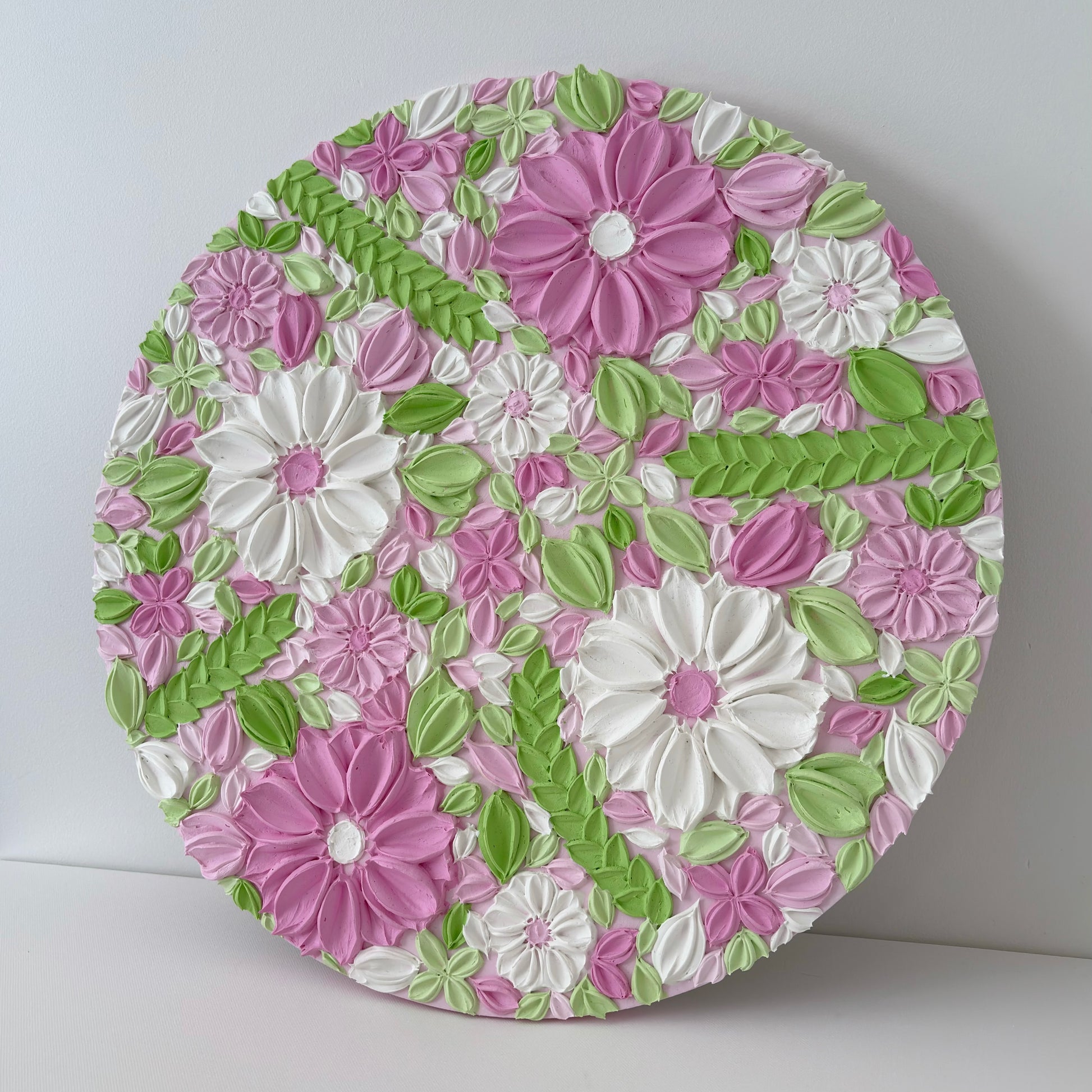 Textured floral painting in shades of pink, green and white, set against a matching pink background.