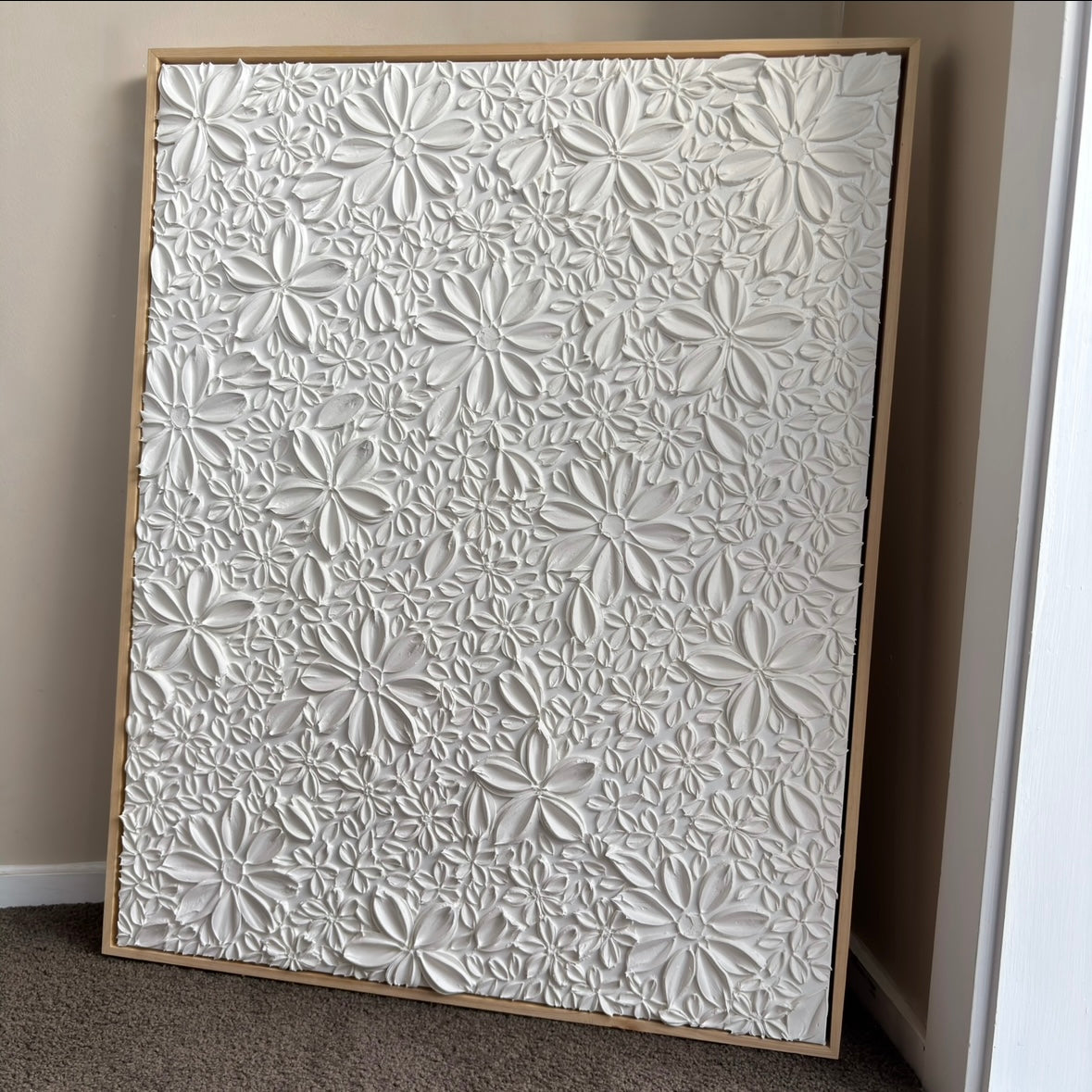 - Medium: White acrylic and modelling paste on stretched canvas. Finished with gloss varnish.